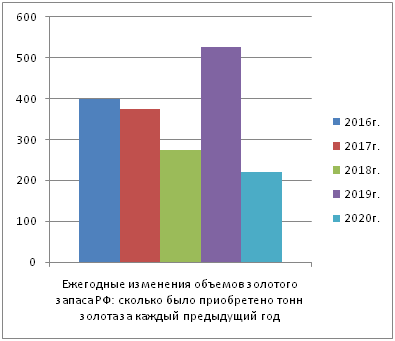Несмотря на то что за 2020 г. было приобретено на 58% меньше золота, чем 2019 г. (см. график выше), общий размер золотого резерва в пересчете в валюту увеличился на 25,71%. Цена на начало учетного периода (январь 2021 г.) составляла 138,754 млрд долл.